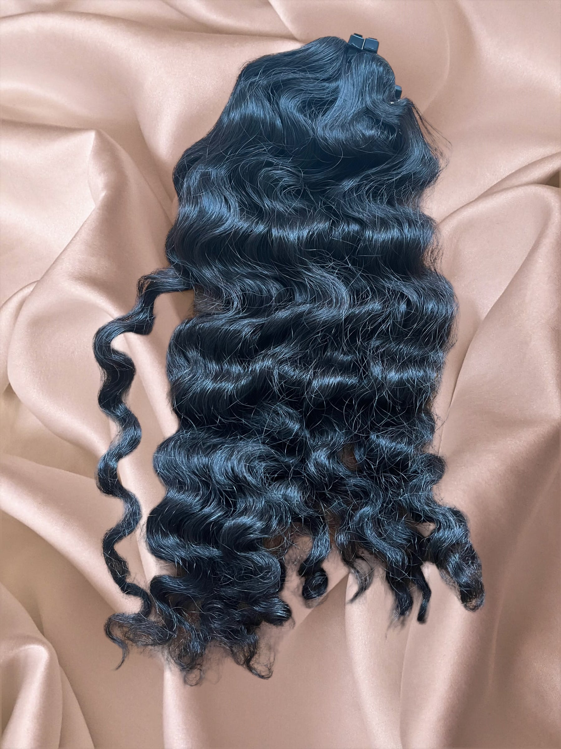 Our hair extensions are made from 100% unprocessed human hair with cuticles running in the same direction - steam curled for texture. We do not use any synthetic fibers or materials in our hair products.